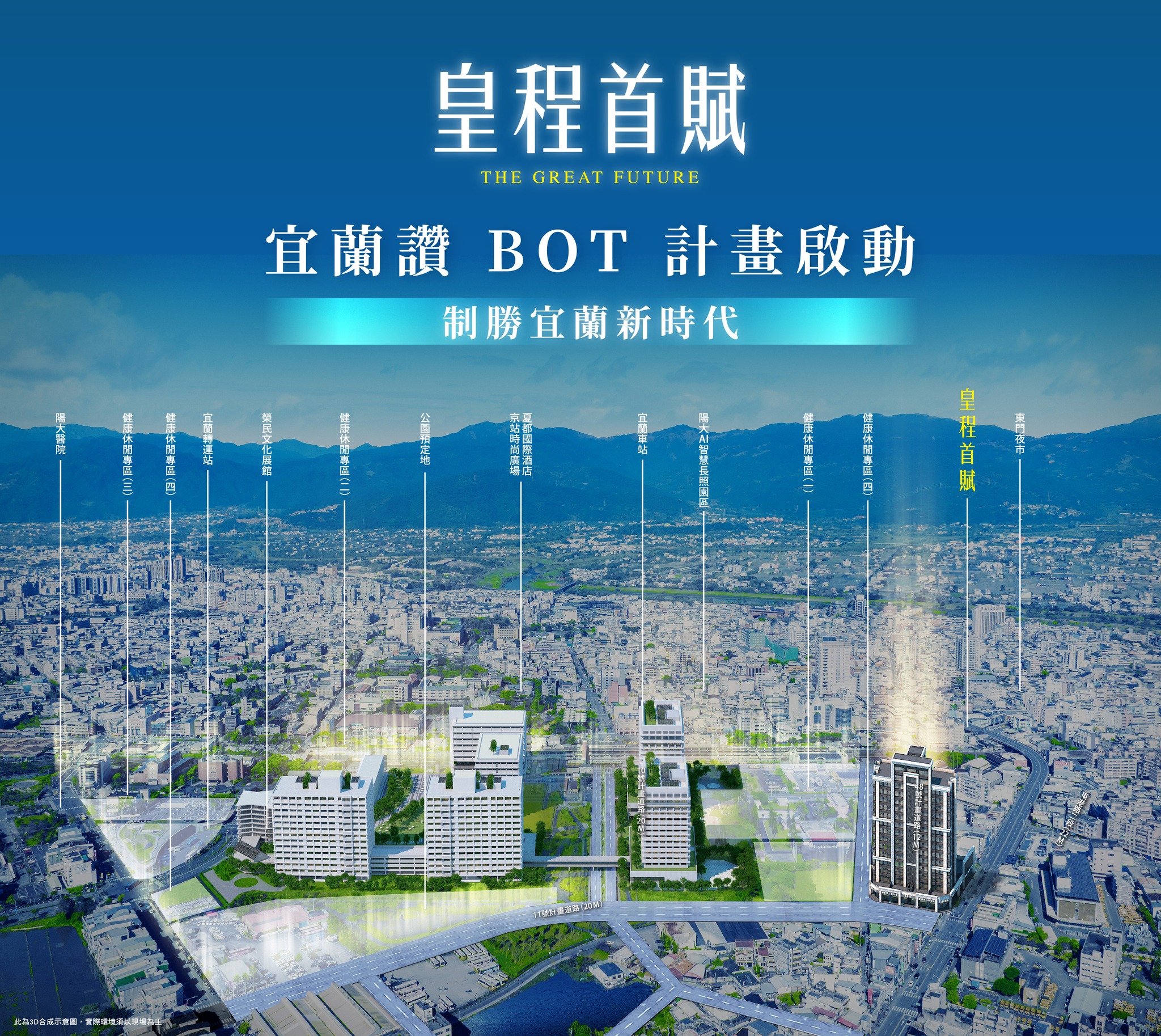 皇程首賦 完工日期:預計2028年第四季 基地位置:宜蘭市東港路二段425號旁 基地面積:約942坪 樓層規劃:地上14層、地下3層 戶數規劃:店面9戶、住宅100戶 建築設計:蕭家福建築師事務所 景觀設計:菁根景觀設計 坐落宜蘭東區稀有心臟地段,鄰宜蘭火車站與轉運樞紐,且擁百億宜蘭讚BOT計畫多重利多加持,承襲世界灣豪宅家族血統,與建築名師蕭家福聯袂打造新古典美學的標誌建築。